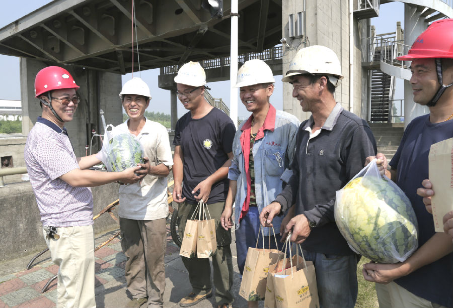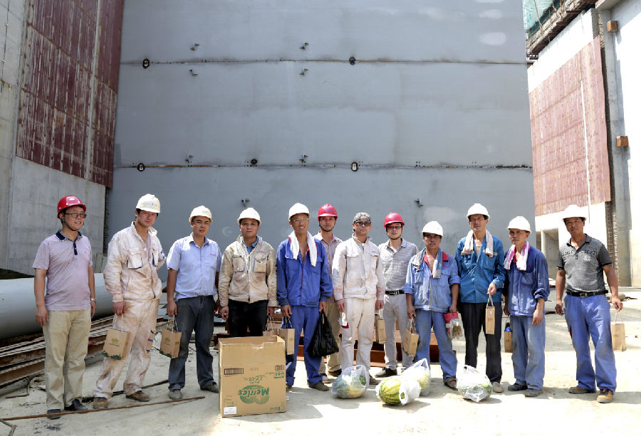 7月25日,水機(jī)公司黨委書記田建京、工會(huì)主席黃統(tǒng)及相關(guān)項(xiàng)目負(fù)責(zé)人一行8人前往芒稻閘、邵仙閘項(xiàng)目施工現(xiàn)場開展 “送清涼”活動(dòng),慰問戰(zhàn)斗在高溫酷暑下的一線員工,送去防暑降溫用品、西瓜和慰問金,囑托現(xiàn)場員工注意施工安全,合理調(diào)整作息時(shí)間,采取必要的防暑降溫措施,團(tuán)結(jié)一心,攻堅(jiān)克難,確保優(yōu)質(zhì)高效地完成項(xiàng)目施工任務(wù)。