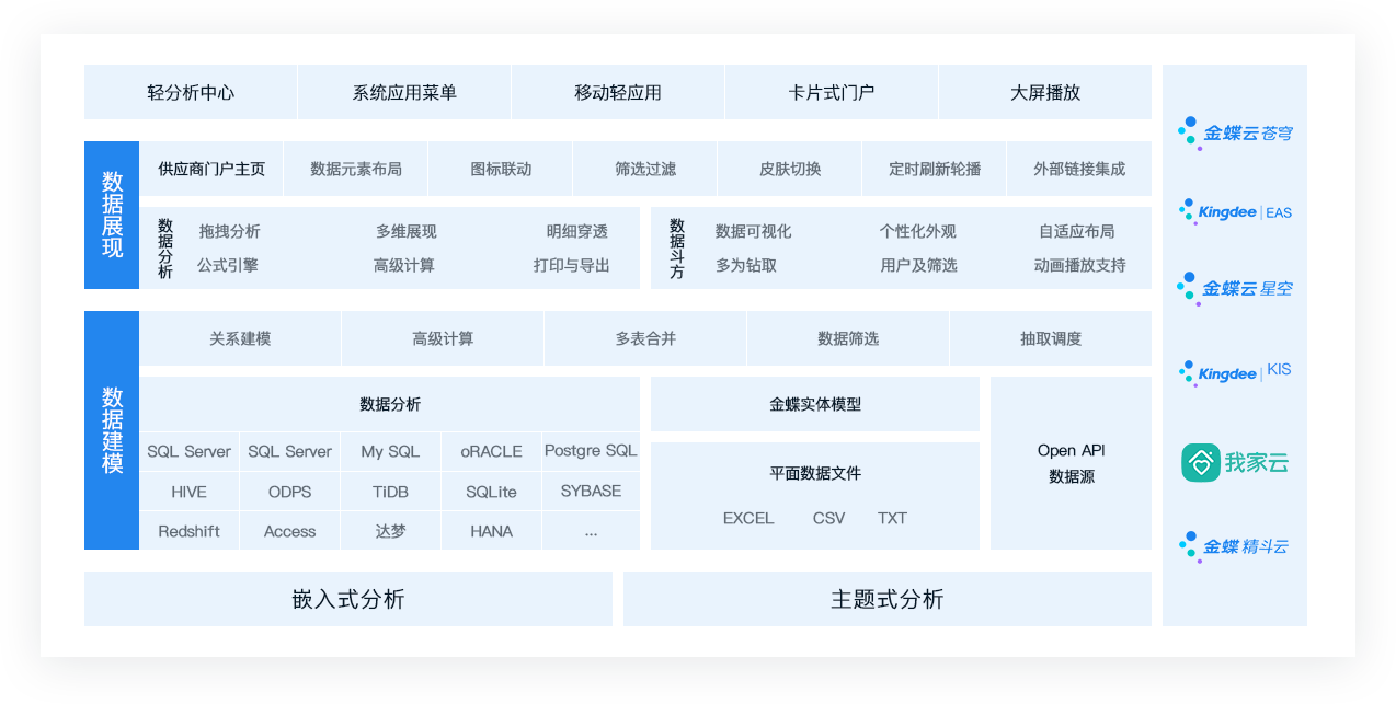 金蝶云·蒼穹數(shù)據(jù)服務(wù)云——輕分析,是金蝶自主研發(fā)的,擁有獨立知識產(chǎn)權(quán)和核心技術(shù)的數(shù)據(jù)云計算引擎和數(shù)據(jù)可視化平臺,為業(yè)務(wù)人員提供了一種輕建模、多維度、高性能的數(shù)據(jù)分析和數(shù)據(jù)探索平臺