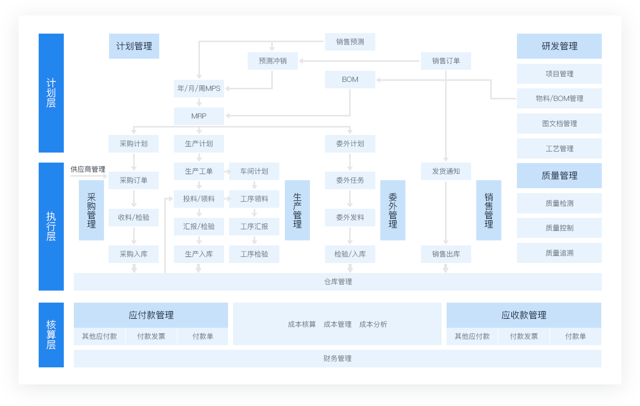 圍繞精細(xì)化計(jì)劃管控、透明化化生產(chǎn)執(zhí)行、全面質(zhì)量管理等作為落地支撐,助力電子行業(yè)企業(yè)從訂單接收、計(jì)劃、生產(chǎn)執(zhí)行到售后及追溯的全流程管控